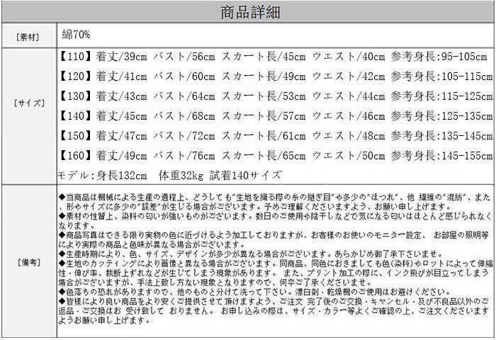 【110】着丈/39cm バスト/56cm スカート長/45cm ウエスト/40cm 参考身長:95-105cm