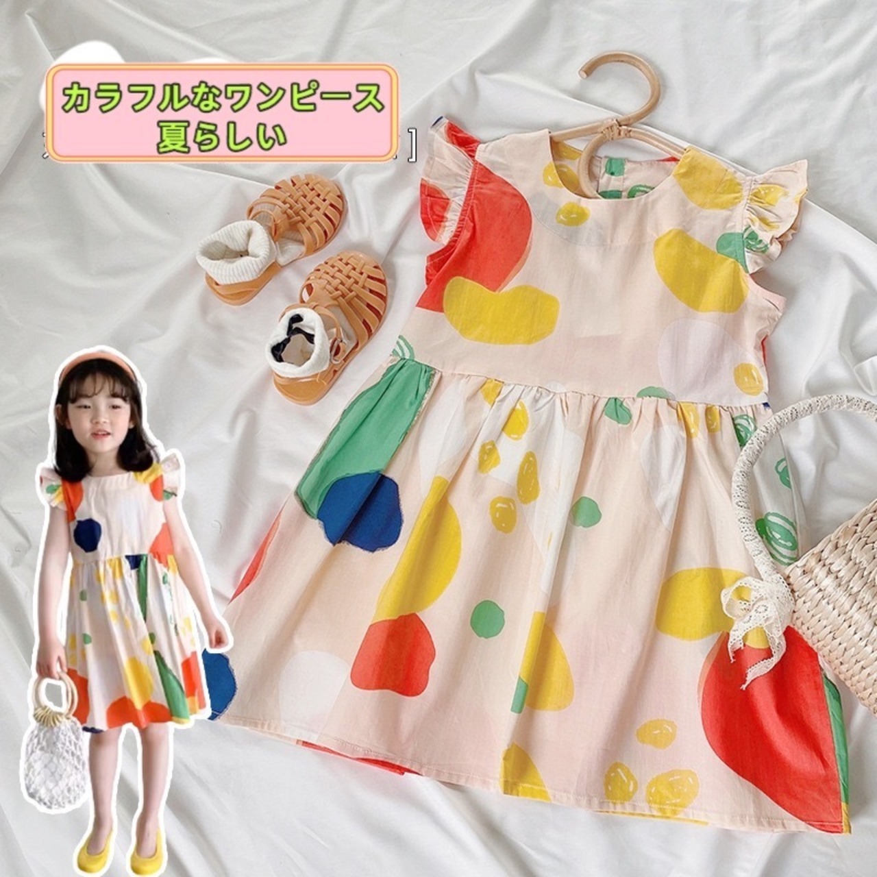 2023夏新作 キッズワンピース カラフル フリル袖 落書き風 韓国風子供服 90-140cm