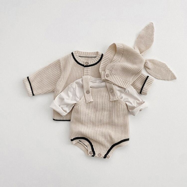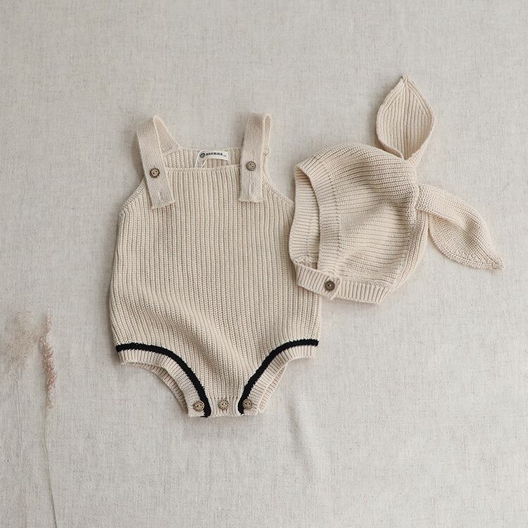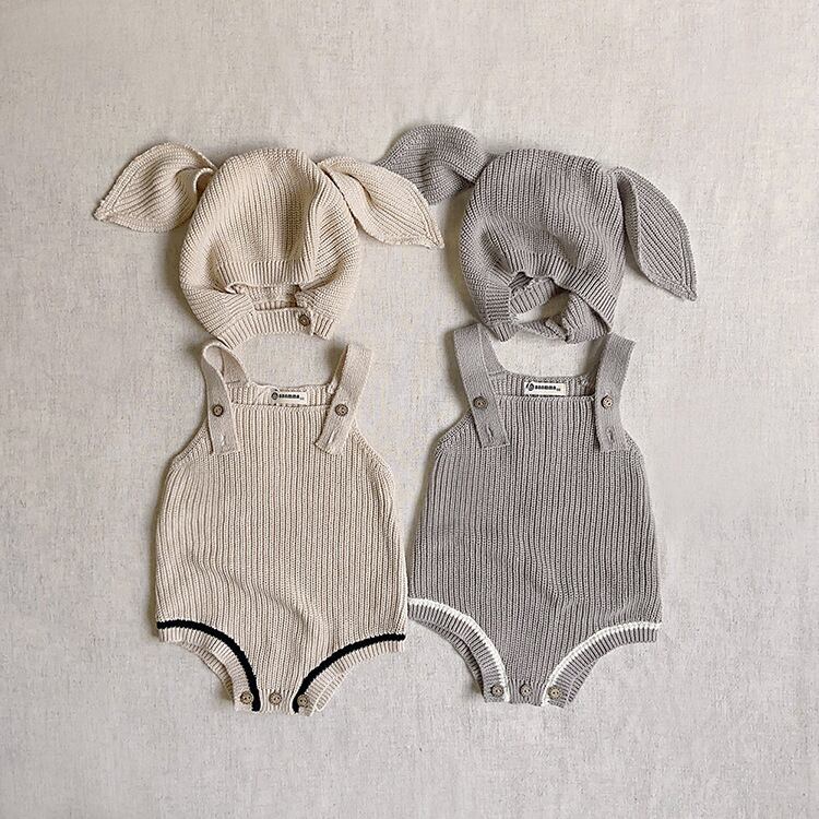 春新作 ベビー服 ニットロンパース ウサギ耳 66-90cm 子供服 無地 帽子付き 可愛い 春秋